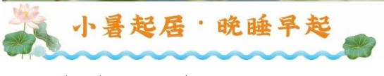 小暑时天亮得早、黑得晚,起居和作息时间应随之调整,晚睡早起,但不宜熬夜过晚。