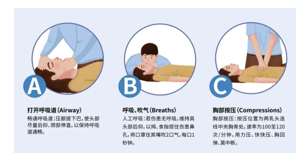 2.溺水心肺复苏:优先开放气道(A)、人工呼吸(B),再进行胸外按压(C),即A-B-C顺序。