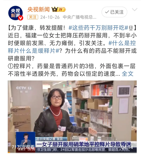 紧急送医后,医生才找出问题所在——她吃的是硝苯地平控释片,这种药,压根不能掰开吃啊!